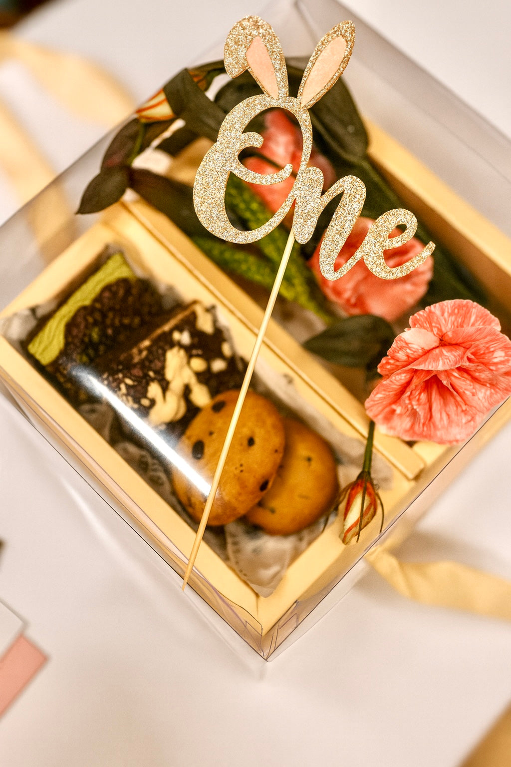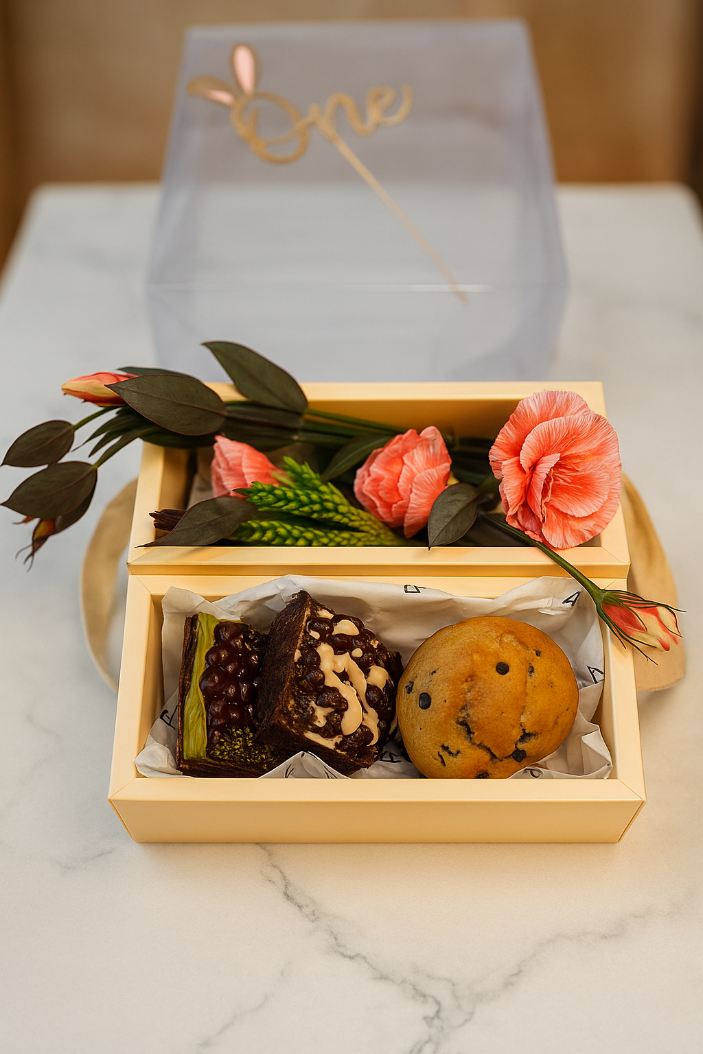 İçerik: Akrilik One yazılı kutuda Blum fındıklı brownie, Blum fıstıklı brownie, 2 adet Blum Chocolush cookie, Blum Antep fıstıklı %70 bitter çikolata ve mevsimine göre seçilmiş bir çiçek.